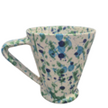La decorazione è realizzata con una tecnica a schizzi, che crea un motivo astratto fatto di macchie e gocce di colore blu, azzurro e verde su uno sfondo bianco crema. L'effetto è dinamico e irregolare, rendendo ogni tazza unica nel suo genere.
